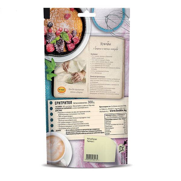 | Съставки | 100% еритритол (Е968) – кристален многовалентен алкохол. Натурален продукт, получен чрез ферментация на царевица. |