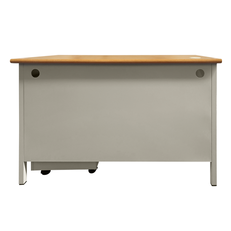 Металното бюро Carmen CR-1320 L комбинира стабилна конструкция с практичен дизайн. Изработено е от прахово боядисан метал с гладко покритие, а плотът му е от ПДЧ с дебелина 25 мм. Бюрото включва подвижен кардекс с три чекмеджета на колелца, който осигурява удобно място за съхранение. Моделът разполага с отвор за кабели и функция за заключване. Цветът е светлосив с плот в цвят бук, подходящ за всяка модерна офис среда. Пълна информация за размерите и характеристиките на модела ще намерите в таблицата в таб/поле "Техническа информация".