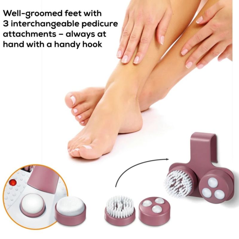 3 enchangeable pedicure attachments with practical hanging; 16 integrated magnets for magnetic field application; Removable roller attachments for foot reflex zone massage; Foot rest with massage nodules; Up to size of shoe of 44
