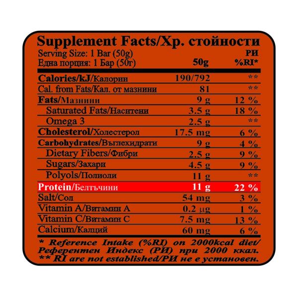 Хранителни стойности за 100 гр. продукт: енергийна стойност - 379 Kcal/ 1584 Kj; калории от мазнини-162 гр.; мазнини - 18 гр. (от които наситени - 7 гр.;омега 3 -5 гр.), холестирол - 35 мгр.; въглехидрати - 18 гр.(от които фибри - 5 гр.; захари - 8,9 гр.; полиоли - 22 гр); белтъчини - 22 гр. (сол - 108 мгр.; Витамин А - 0,4 мкгр.; витамин Ц - 15 мгр.; калции - 120 мгр.