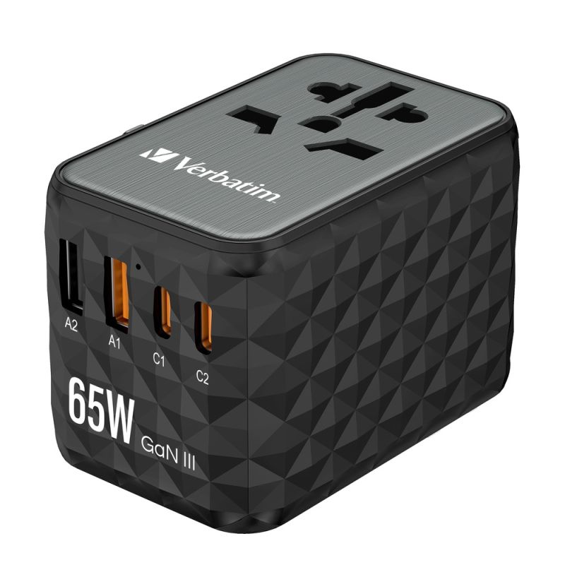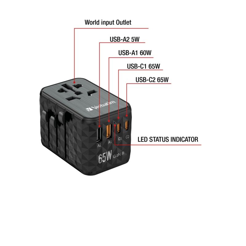 Адаптер Verbatim UTA-05 GaN III Universal Travel Adapter with 2 x USB-C PD 65W & QC 4+ / 2 x USB-A